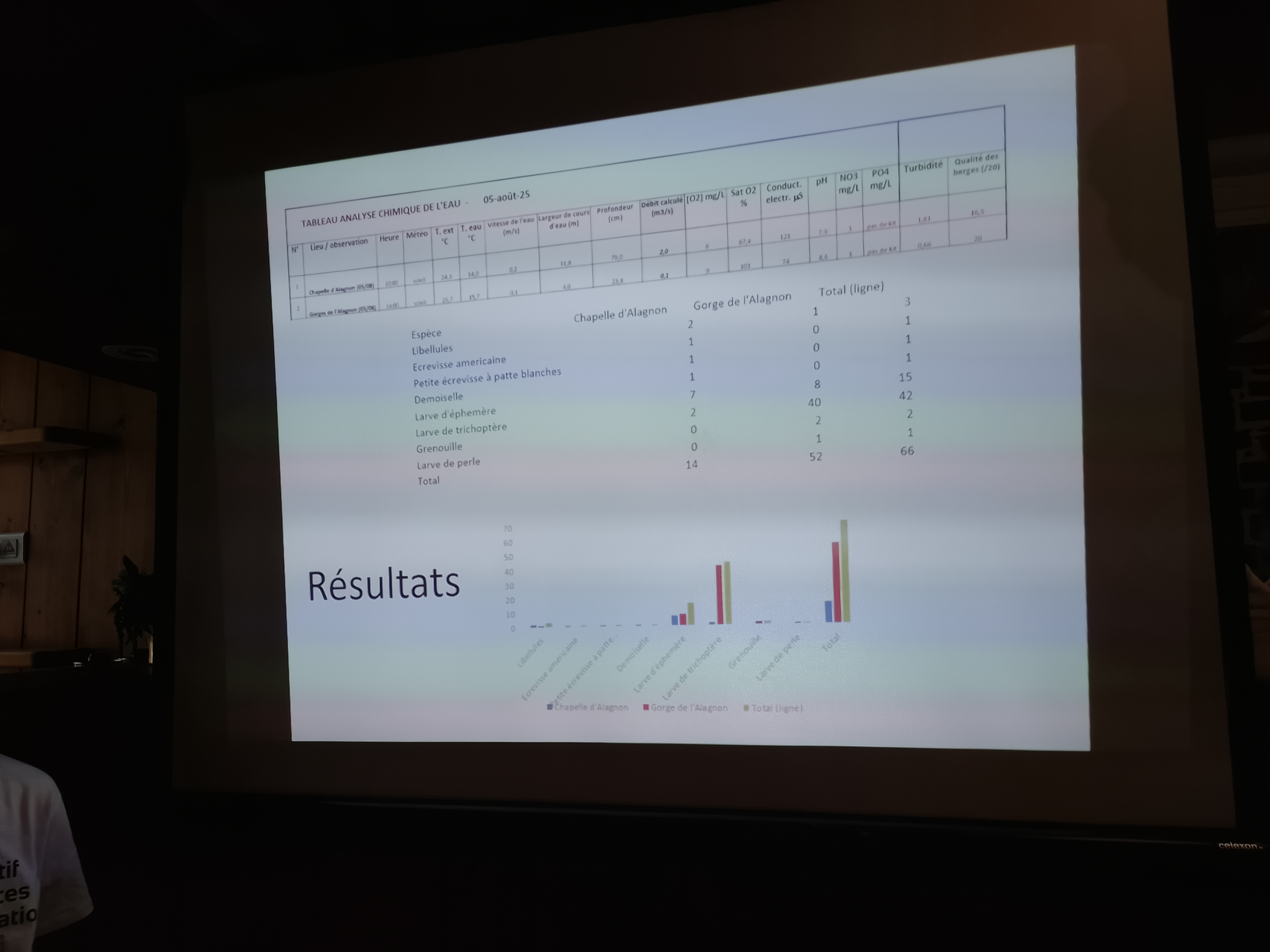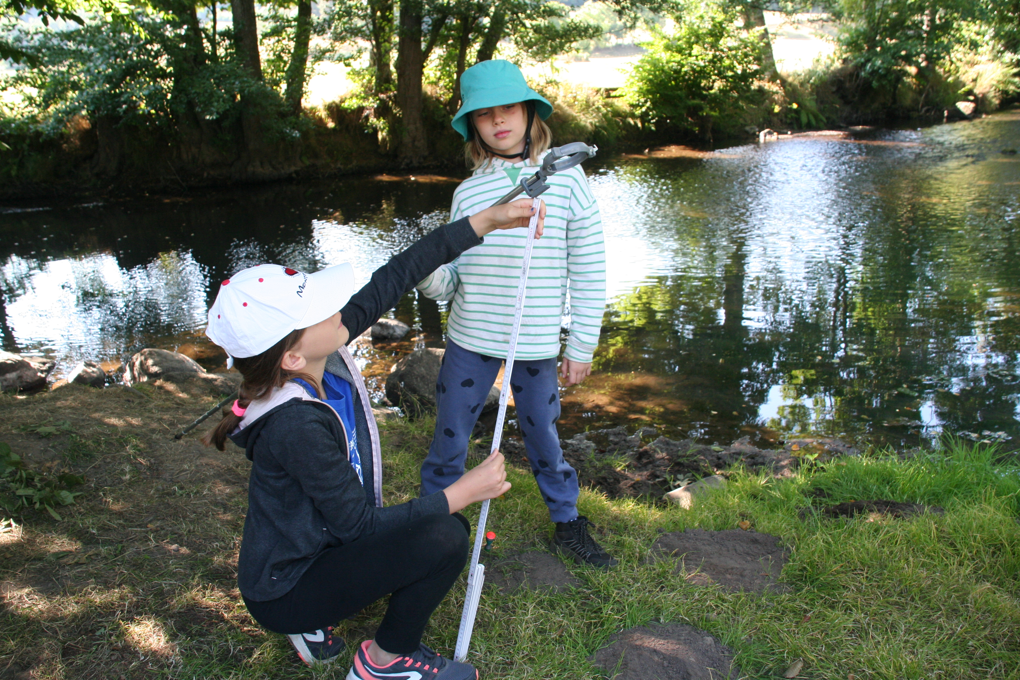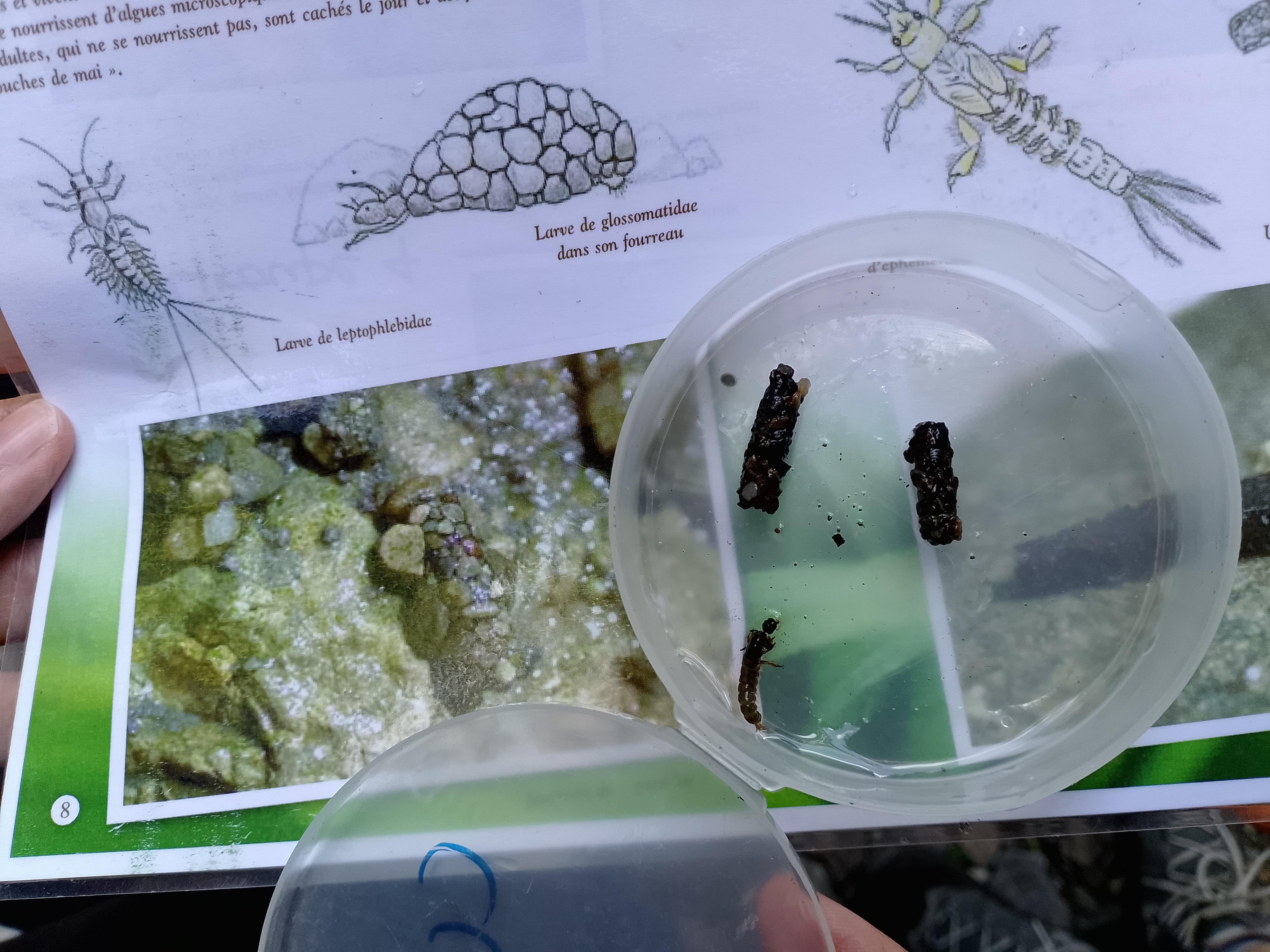 Suite à cette légère déception passagère, nous partîmes faire nos premiers prélèvements d’eau. Depuis les berges de l’Alagnon, juste en aval de la station d’épuration de Murat, nous avons mesuré des grandeurs physiques telles que le PH, la conductivité, la teneur en oxygène de l’eau du fabuleux ruisseau 😊 ! Puis, nous nous attaquâmes à la vie aquatique ; larves d’insectes en tout genre (éphémères, trichoptères…), écrevisses américaines et grenouilles, rien ne nous échappa !