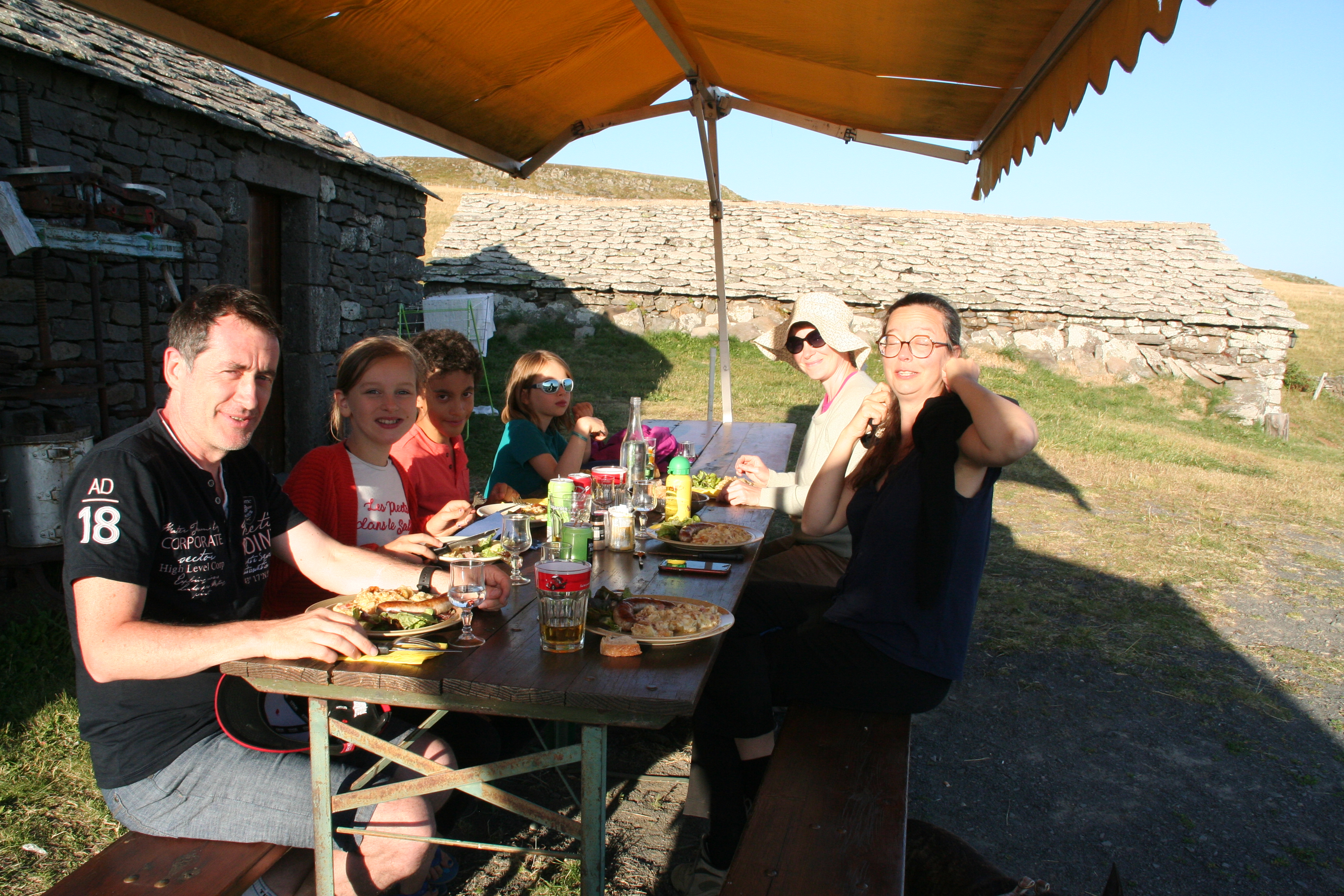 Ensuite nous sommes partis au Buron de la Combe de la Saure, en endroit loin de tout , magnifique à 1500 m. En arrivant nous avons installé rapidement notre campement. Puis nous avons mangé une délicieuse truffade sur la terrasse du buron avec une vue sur la vallée glacière de Brezons, au loin, une de plus belles de France !. Pour bien digérer, nous avons marché en direction du cirque de Grandval. Laika, la petite bouledogue, nous a accompagné avec entrain.